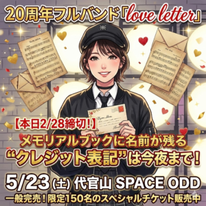 だけどフルバンドは、気持ちだけじゃ成立しない。簡単ではない。だからこそ、20周年という節目で、勇気を持って大きな挑戦にしてしまう。フリーランスとして、今できる精一杯で成功させたい──その覚悟が、今回の「love letter」には詰まっています。